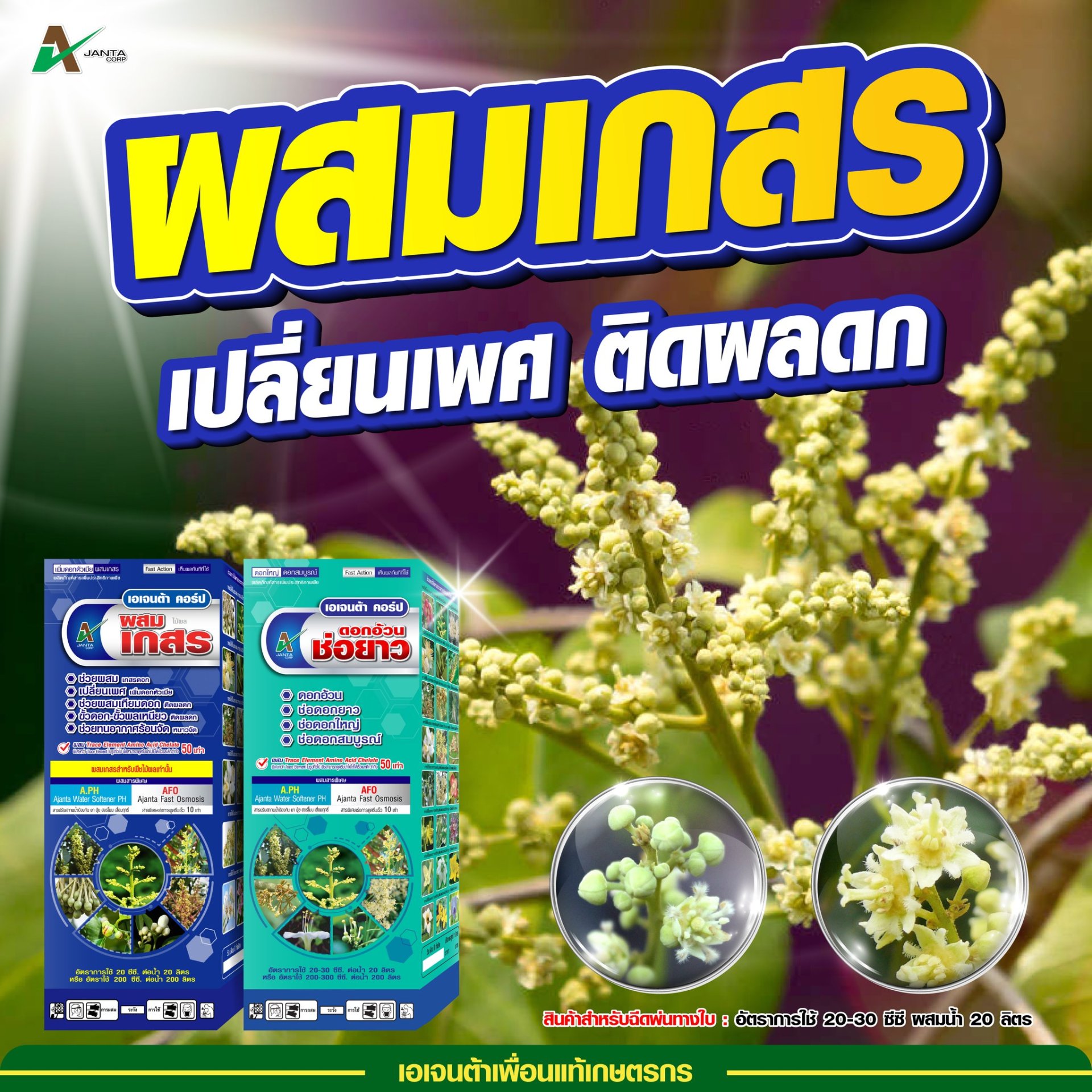- ชุดผสมเกสรเปลี่ยนเพศ เป็นสารผสมที่ประกอบด้วยฮอร์โมนและสารอาหารที่ช่วยปรับสมดุลเพศในช่อดอกมะม่วง โดยจะทำหน้าที่เพิ่มจำนวนดอกตัวเมียและลดสัดส่วนดอกตัวผู้ ทำให้เกิดการผสมเกสรได้ดีขึ้น และช่วยลดการหลุดร่วงของดอกและผลอ่อน