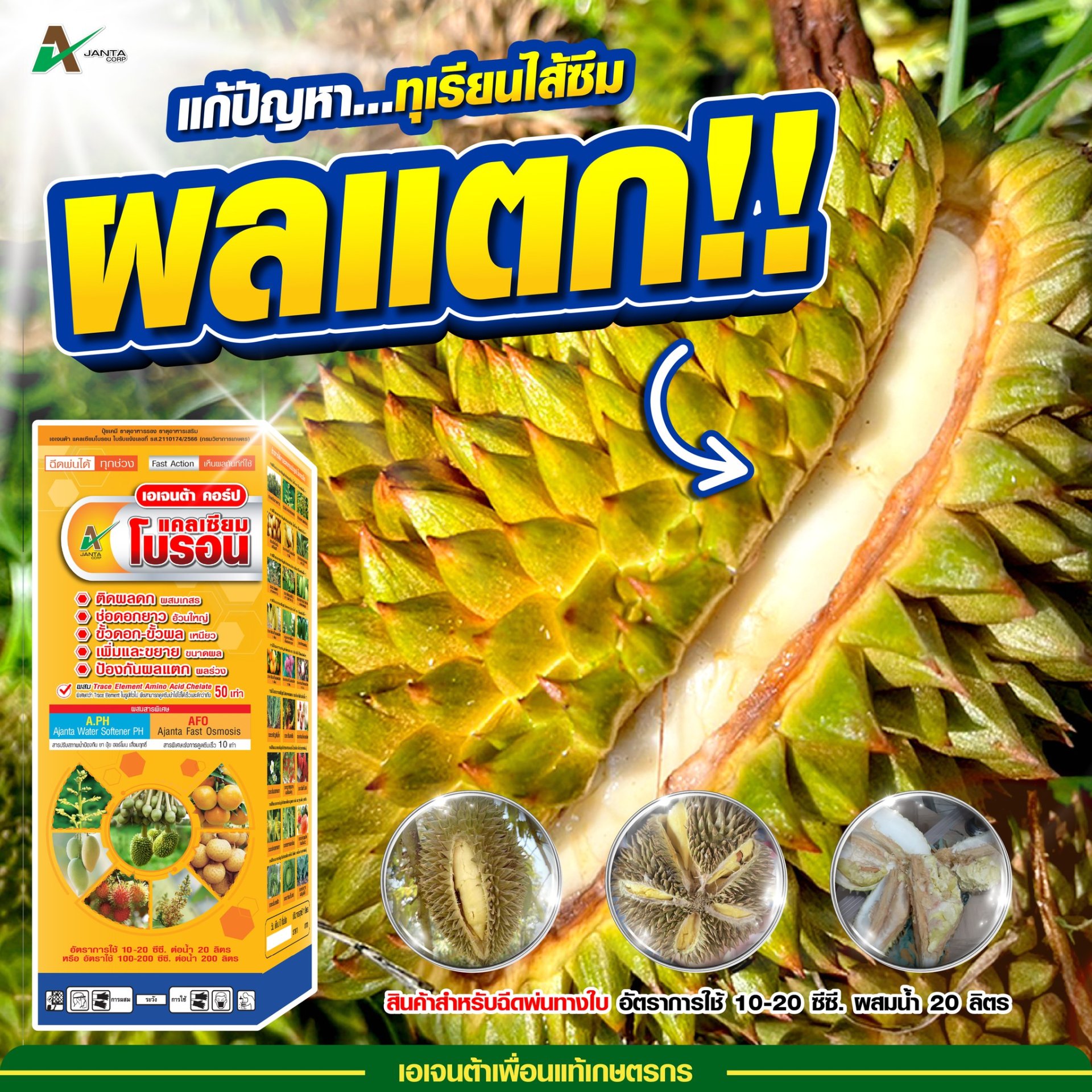 ปัญหาทุเรียนผลแตก เปลือกแตก ไส้ซึม เนื้อเละ เนื้อแฉะที่เกิดขึ้นช่วงก่อนเก็บผลผลิต สามารถแก้ไขได้อย่างมีประสิทธิภาพด้วยแคลเซียมโบรอน ที่มีคุณสมบัติธาตุอาหารรอง อะมิโน คีเลต แอซิด เข้มข้น ซึมไว