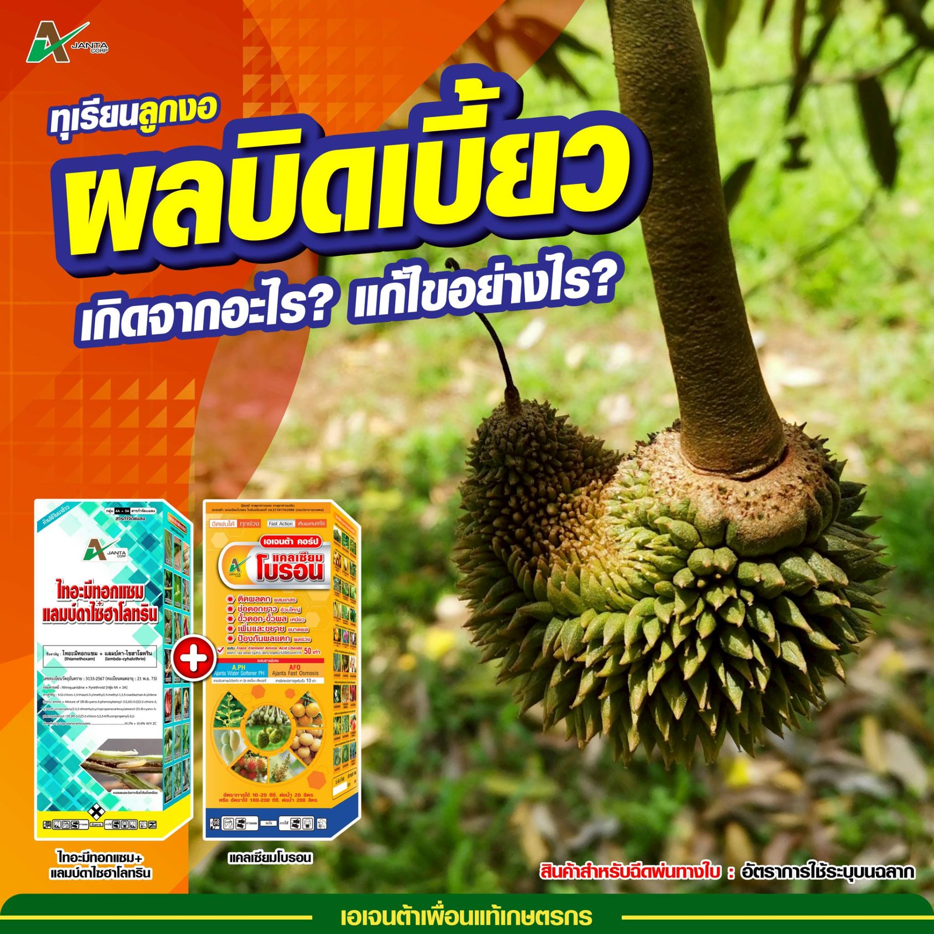 ธาตุอาหารรอง/เสริม ไม่เพียงพอ ในทุเรียนระยะผลเล็ก เป็นสาเหตุที่ทำให้ ทรงของผลบิดเบี้ยว ผลงอ เปลือกหนาและหลุดร่วงสูง จึงควรหลีกเลี่ยงการให้ปุ๋ยที่มีไนโตรเจนสูง (ตัวหน้าสูง) ในช่วงที่ต้องการพัฒนาผลหรือในช่วงที่ทุเรียนติดผลเล็ก และฉีดพ่น #แคลเซียมโบรอน เพื่อช่วยให้ผนังเซลล์แข็งแรง ลดการหลุดร่วงของผล ส่งเสริมการเจริญเติบโต และการพัฒนาของผล